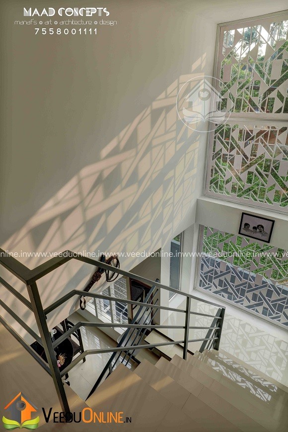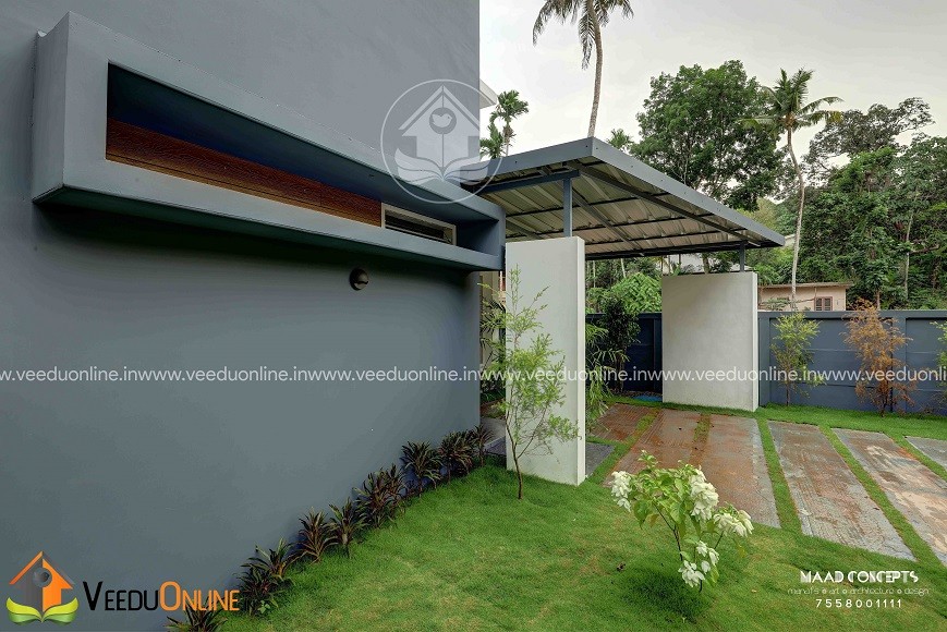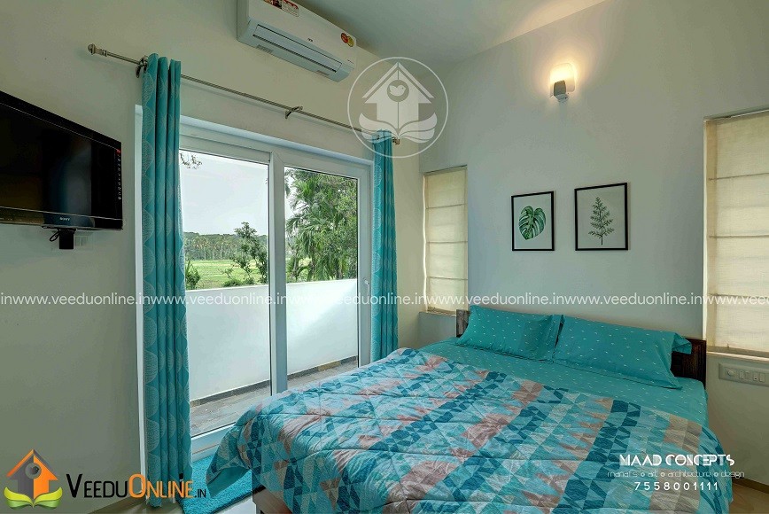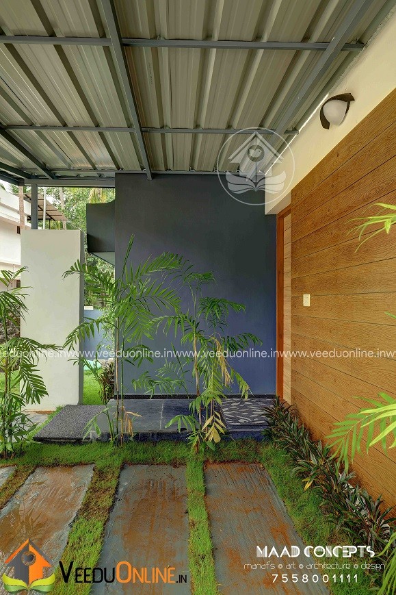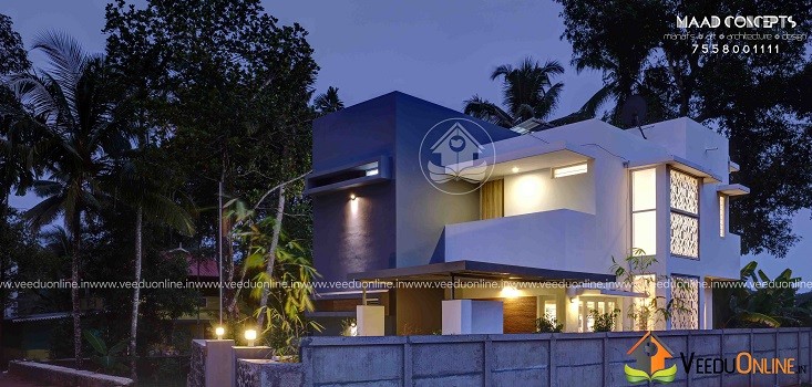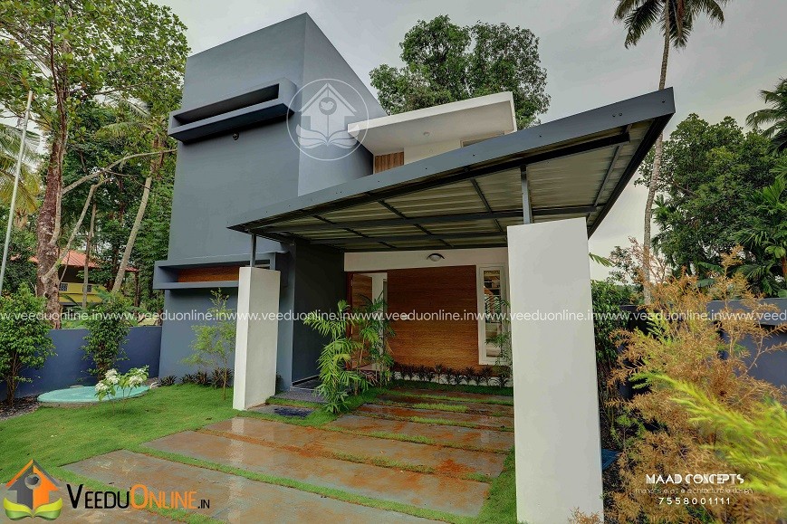 It is a 1200 square feet house built in 4 cents land at Chottanikkara. Completed in 2017. This is a 3 bedroom house all with attached bathroom, separate dressing room and balconies. Tried to stick on to the very limited budget my client had and finished it in a very simple yet elegant way yet following all aspects of Vastu. This house though a budget home, got all the amenities an ultra luxury villa have like patio, balconies etc. As far as the design goes, we approached a contemporary, minimalist design to reduce cost. Even though the house looks as if there are no windows/openings from the front view, once you enter the house, it’s a totally different story. Rooms are all well lighted with huge openings everywhere which helps reduce electricity consumption.