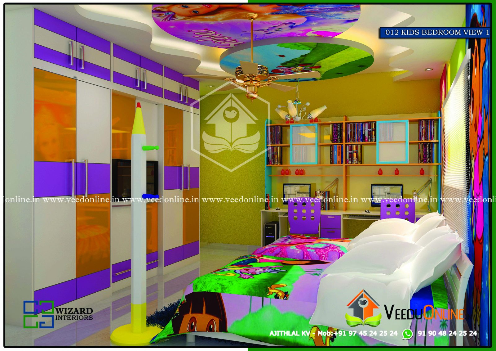 Kerala homes are designed with the most excellent and beautiful interior designs which are spectacular among the best ones for the k. This stylish interior design is an extra ordinary one which makes out with the cartoon characters with the finish of painting. Interior designing concerns itself with the best visual and ambient enhancement of an interior space which also seeks to optimize and harmonize the relevance to construct out the best environment to put on and improve our lifestyle. The practice of Interior designing enriches the pragmatic aspects of realizing buildings and structures, including construction administration, cost estimation and scheduling. Documentation produced by architects, plans and technical specifications, typically drawings, defines the structure and behavior of a building or other kind of system that is to be or has been constructed. The living and bedroom are very well designed and the kitchen along with work area are really spacious. This plan is designed in a manner for the latest interior designs. This plan is well executed by wizard. For further details contact the designer.